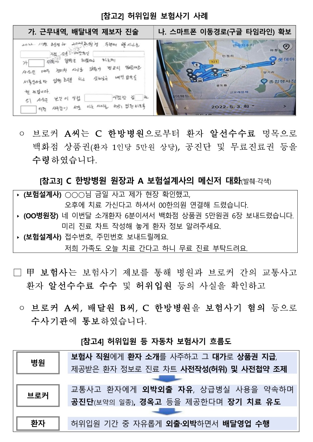 - 브로커가 경미한 교통사고를 당한 환자에게 특정 한방병원을 소개하며, 의사 대면 없이도 입원 가능하다고 안내.