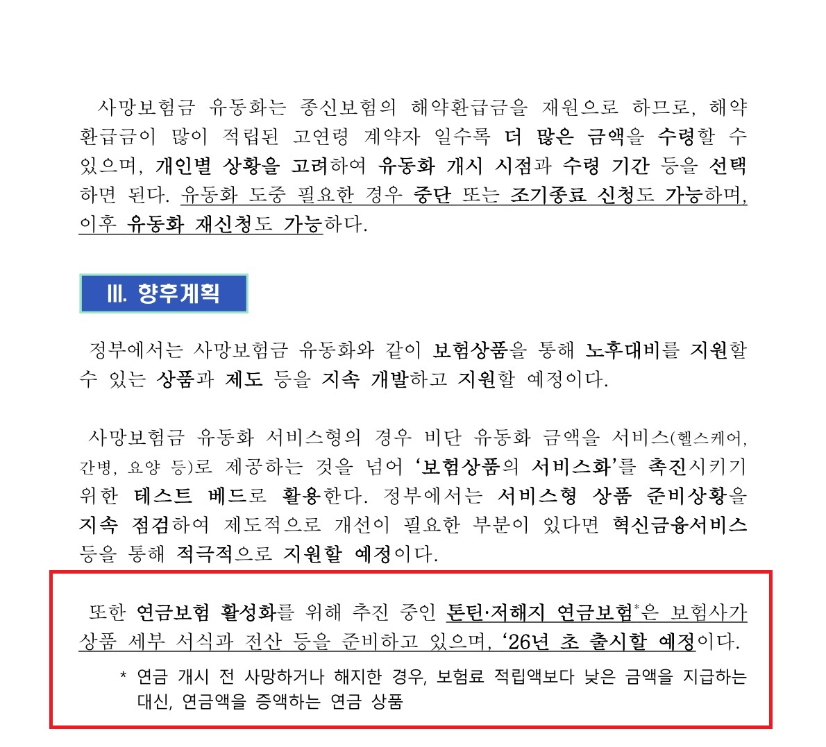 사망보험금 유동화를 노후소득 보완형 금융제도로 정착시키겠다는 방침입니다.