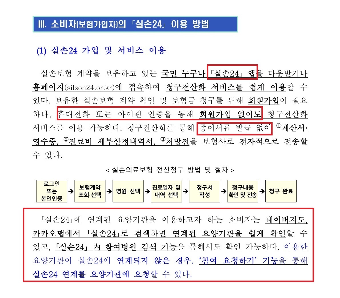‘실손24 앱 또는 홈페이지(silson24.or.kr)’에서 바로 보험금을 청구할 수 있습니다.